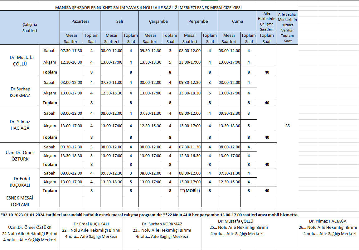 Şehzadeler 4 Nolu Aile Sağlığı Merkezi Esnek Mesai Saatleri Çizelgesi